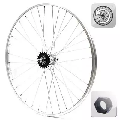 La roue arrière est composée d’un moyeu avec système de rétropédalage. Système qui permet de freiner en pédalant vers l’arrière. D’un diamètre de 26 pouces, la roue a une jante de 21 mm de large et de 559 mm de diamètre interne. Soit, un ETRTO de 21-559. Le moyeu est un axe plein à écrous avec un pignon une vitesse 20 dents. Son entraxe est de 110 mm. Si vous souhaitez changer la transmission de votre vélo, nous proposons un pignon avec moyeu rétropédalage ou vitesse intégrée. La roue est fournie avec un pignon de 20 dents. Il vous est proposé en Options, d’autres pignons : en 16, 18 ou 19 dents.