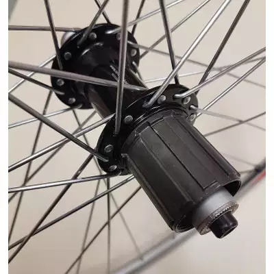 Le moyeu de cette roue de vélo est équipé d’un filetage pouvant accueillir une cassette. Il est possible d’y mettre sur les supports de cassette 8, 9 ou 10 vitesses, comme par exemple :