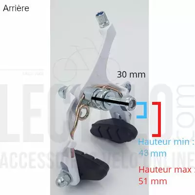 Les étriers de frein Caliper avant et arrière sont prévus pour s’installer sur des roues vélo 700C ou 28 pouces, présentes généralement sur des vélos de route, course ou fixie. Ils sont équipés chacun de deux patins de frein, moulés type Shimano 105, de 50 mm. La marge de règlage, entre l’axe de fixation et la jante, est de 43 à 51 mm. Le frein avant est fourni avec une tige de fixation de 50 mm de long ; le frein arrière, avec une tige de fixation de 30 mm. L’ensemble pèse 365 grammes.