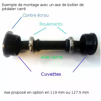 Pour le serrage des cuvettes, tournez la cuvette gauche dans le sens des aiguilles d’une montre et la cuvette droite dans le sens inverse des aiguilles d’une montre. Pour vous aider,, utilisez une clef de boîtier de pédalier. Afin de visser le contre-écrou de la cuvette (côté gauche), munissez-vous d’une clé à écrou. Notez que ce système requiert un entretien régulier des billes et de l’axe qui passe par un nettoyage et la lubrification des pièces avec de la graisse blanche pour roulements afin d’éviter l’usure suite aux frottements.