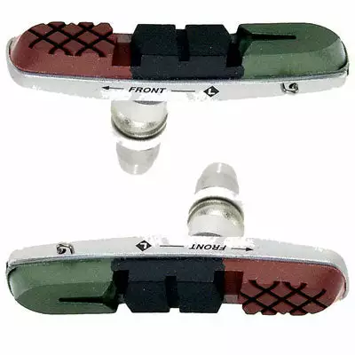 Ils sont constitués de trois gommes pour répondre au mieux au besoins de freinage. Une première gomme verte permet d’avoir de très bonnes performances de freinage même en condition humide, la deuxième gomme noire est prévue pour offrir de très bonnes performances de freinage lorsque le temps est sec. La dernière gomme, marron, permet de réduire le bruit fait par les patins en frottant sur la jante du vélo. Ces différentes gommes font que ces patins ont une très grande efficacité lors du freinage. Ces patins sont fournis avec leur support en aluminium. Ils se fixent à l’étrier par écrou. Ces patins sont fournis par paire.