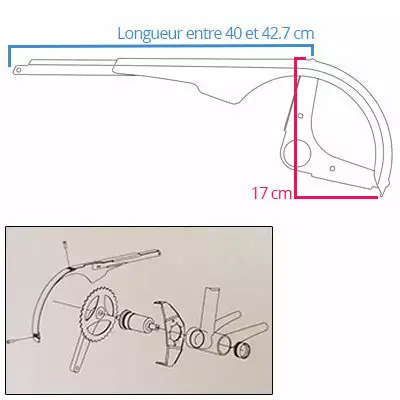 Le carter chaine pèse 290 grammes. Il est fourni avec trois pièces montées (voir photo) permettant la fixation sur le cadre du vélo. Parmi les pièces, une bague permet de fixer le carter à la base du cadre, dont le diamètre de tube doit être de 2 cm. La bague est recouverte d’un collier de protection en caoutchouc. Un triangle permet d’ajuster la position pour aider à la fixation.